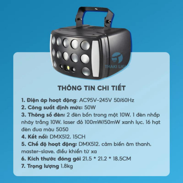 ✅ Đa chức năng: Kết hợp giữa đèn LED và lazer, tạo hiệu ứng ánh sáng đa dạng và phong phú cho các buổi biểu diễn.