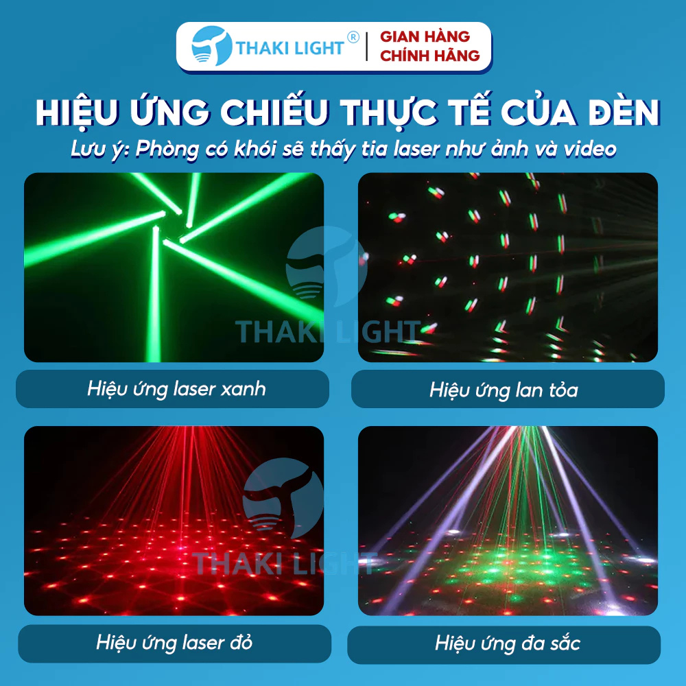 ▶ Hiệu ứng ánh sáng đa dạng: Tích hợp nhiều hiệu ứng laser như tia quét, bầu trời sao, hình nón và xoay tròn, tạo nên không gian ánh sáng sống động và ấn tượng.
