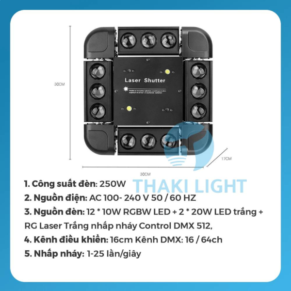 - Thông tin sản phẩm Đèn moving 12 mắt vuông THAKI Đèn laser chớp Cảm biến âm thanh,đèn sân khấu, sự kiện, quán hát, hỗ trợ DMX